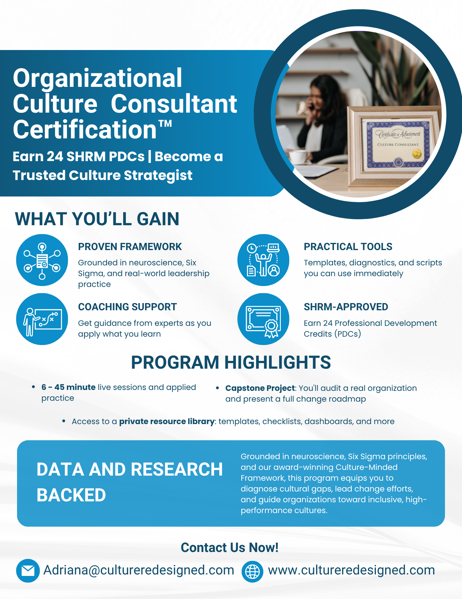 This program is SHRM-accredited and grounded in behavioral science, systems thinking, and practical consulting frameworks that ensure lasting cultural impact.